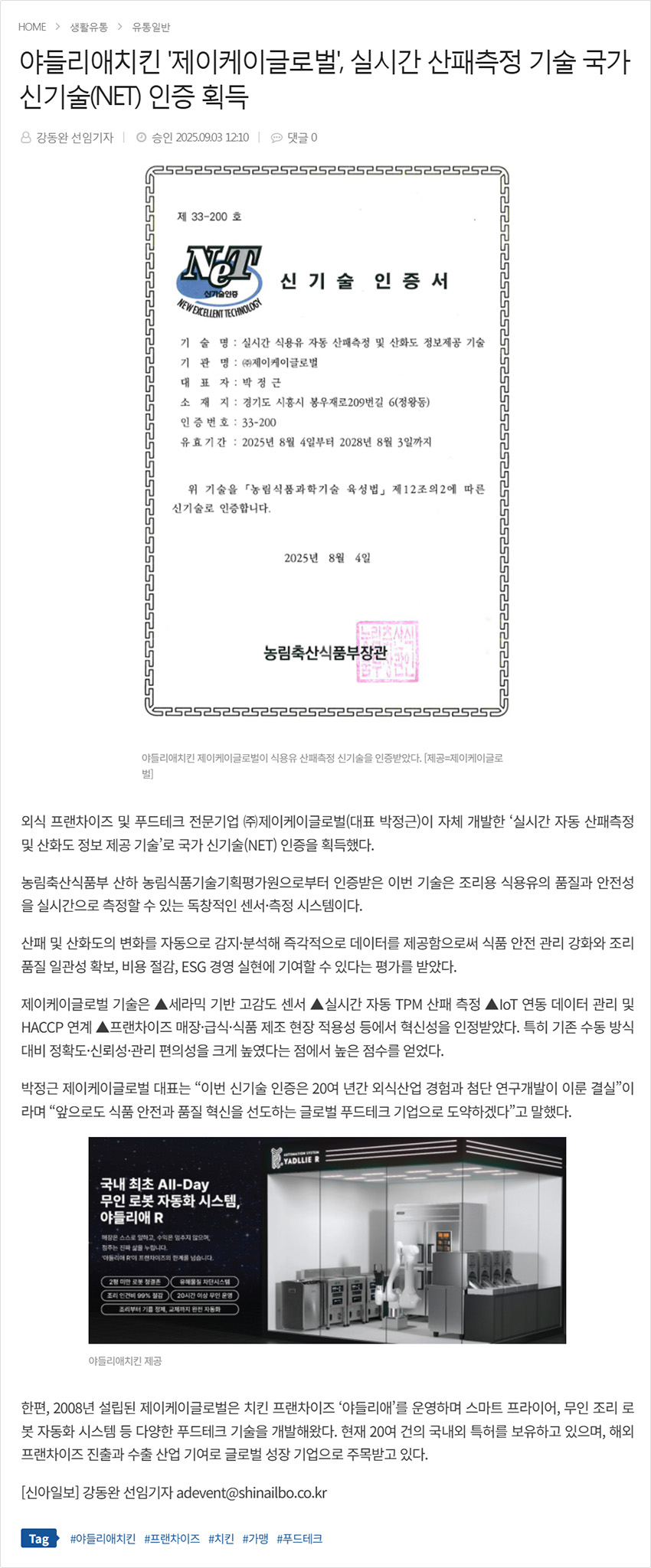 야들리애치킨 ‘제이케이글로벌’, 실시간 산패측정 기술 국가 신기술(NET) 인증 획득 Yadllie News 야들리애치킨 ‘제이케이글로벌’, 실시간 산패측정 기술 국가 신기술(NET) 인증 획득 신아일보 – 2025-09-03 *기사출처: https://www.shinailbo.co.kr/news/articleView.html?idxno=2109681 목록보기 yadllie122025-09-29T14:55:02+09:00