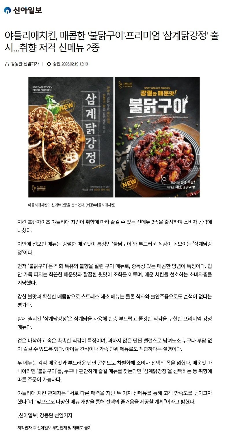 야들리애치킨, 매콤한 ‘불닭구이’·프리미엄 ‘삼계닭강정’ 출시…취향 저격 신메뉴 2종 Yadllie News 야들리애치킨, 매콤한 ‘불닭구이’·프리미엄 ‘삼계닭강정’ 출시…취향 저격 신메뉴 2종 신아일보 – 2026-02-19 *기사출처: https://www.shinailbo.co.kr/news/articleView.html?idxno=2185477 목록보기 yadllie122026-02-20T10:29:48+09:00
